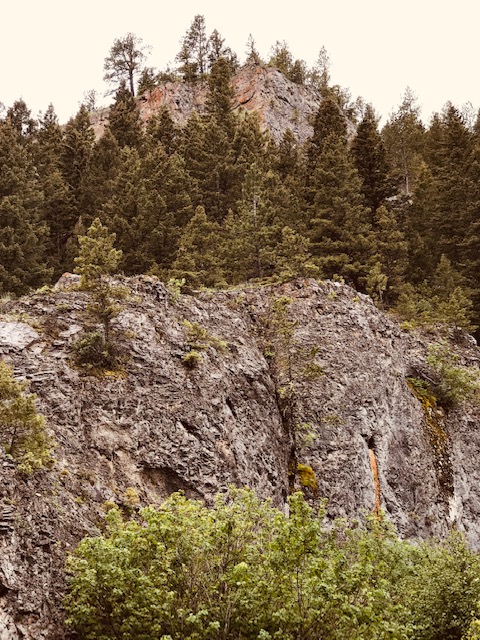 When we left Gilt Edge we drove through Maiden Canyon and the terrain changed considerably. Gone were the open views of the Judith Mountain foothills and in their place we saw large rocky outcroppings, curvy roads and tall coniferous trees. It was the third week in June and wildflowers were blooming alongside the gravel road. It drizzled rain part of the time but the road was in good shape, no worries there.